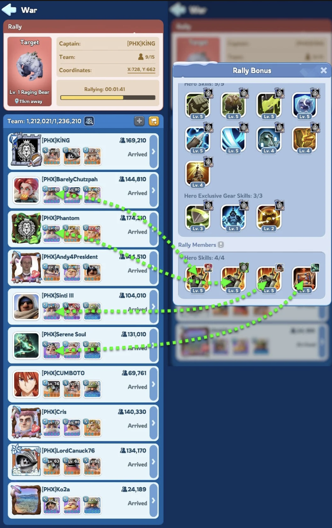 - If yours does not align, due to skills and Stars(Level) Please focus on using Heroes that boost damage for your rally!