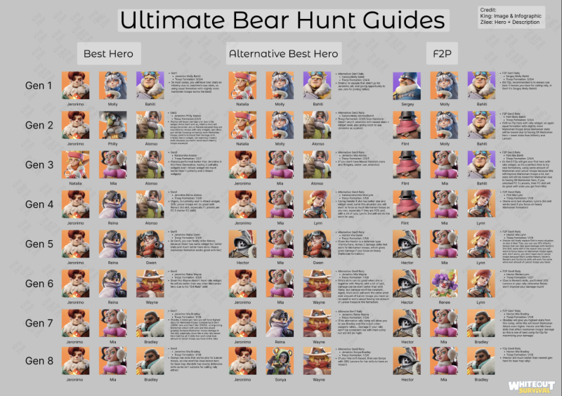 ANY Hero that has a chance base to activate it's skill, only ONE CAN BE USED per rally. So if two Lynns, Mias or other heroes that have chance are paired up in a rally. ONE OF THEM DOES NOT GET USED. If you had 4 Mias, as active rally joiners in a rally, only one is being used! We waste those other slots. So then, in turn, your rally leader damage Deeply falls off and so does yours! We must ensure the rally caller gets the best %, so we can get our highest score. Sending no hero, and only having the leaders listed above would increase your score by a lot! To get out of this, you can do what I do, if you have a hero with 1 star or 2 stars, the odds of it becoming a lead Joiner, is almost null. So make as many PRESET SQUADS rallies you can with ones up top. If you have a 1 star, you can use it to lead your rallies, but make sure you let people know during the bear, that its a 1 star and to NOT boot you!